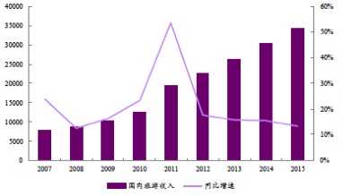 2015年中国国内游客突破40亿人次,国内旅游收入达3.43万亿元,伴随可支配收入增加,满足基本生活需求后,消费者开始出现精神层面的消费需求,造成文化与旅游业快速发展,第十二届全国人民代表大会发布了十三五规划纲要,纲要多次提到文化与科技的结合,也是政策趋势。